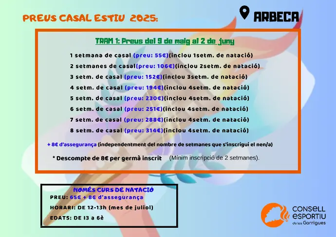 Hi ha dos trams d’inscripció: del 9 de maig al 2 de juny i del 3 al 11 juny. Del 9 de maig al 2 de juny, els preus per setmana canvien segons el